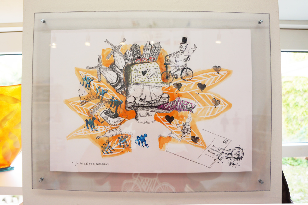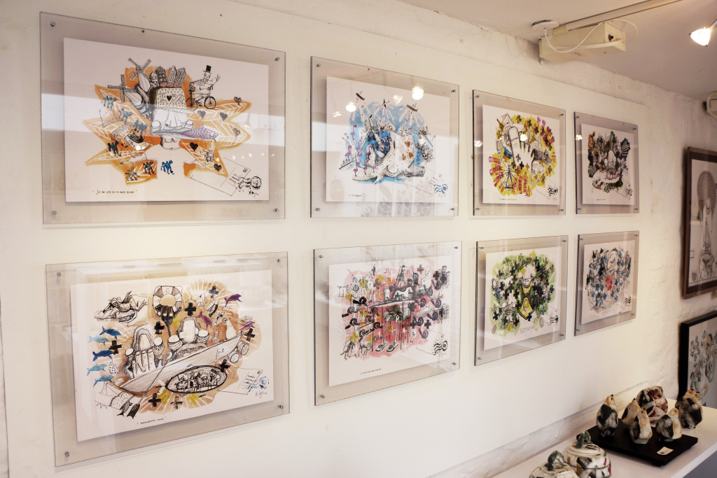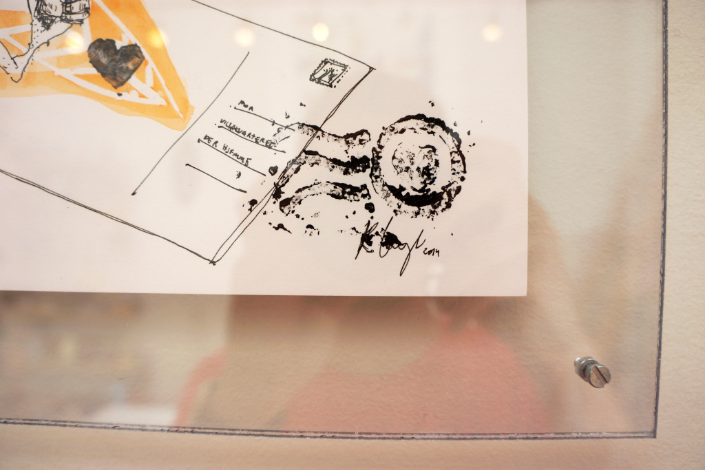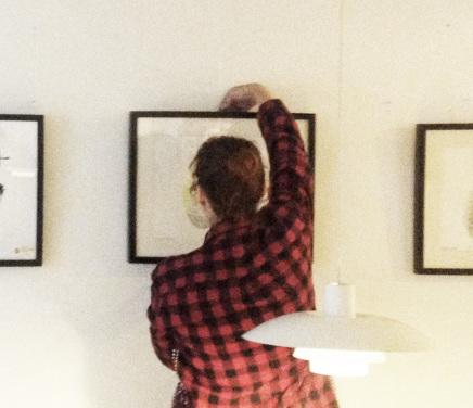 Jeg har både eksperimenteret i forhold til tegningernes udtryk, men også i forhold til indramningen og den måde de præsenterer sig på,