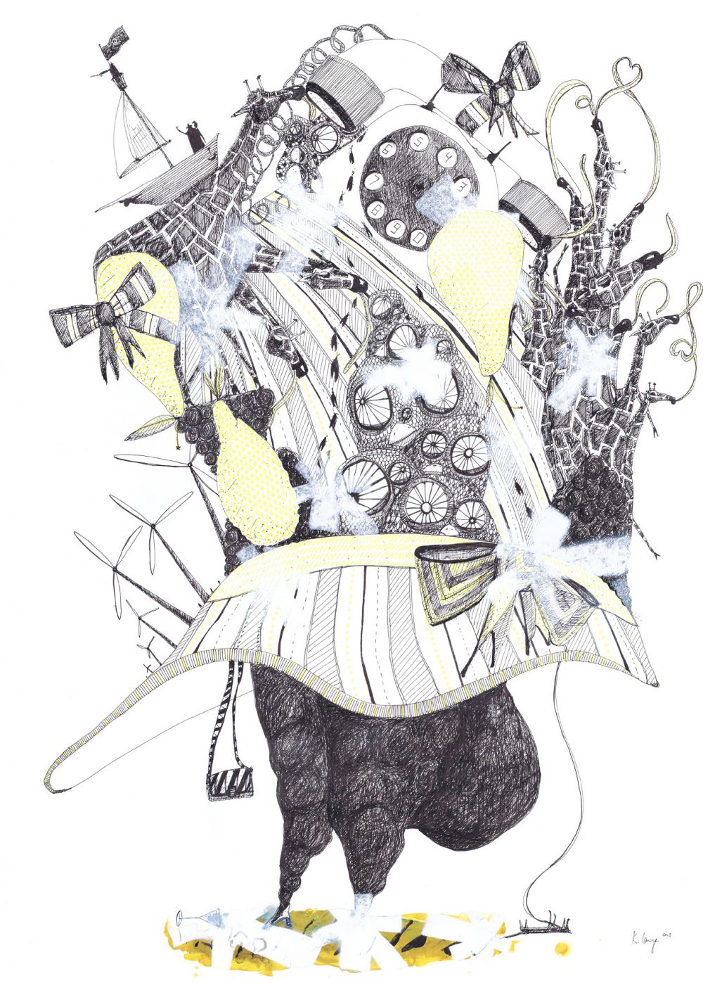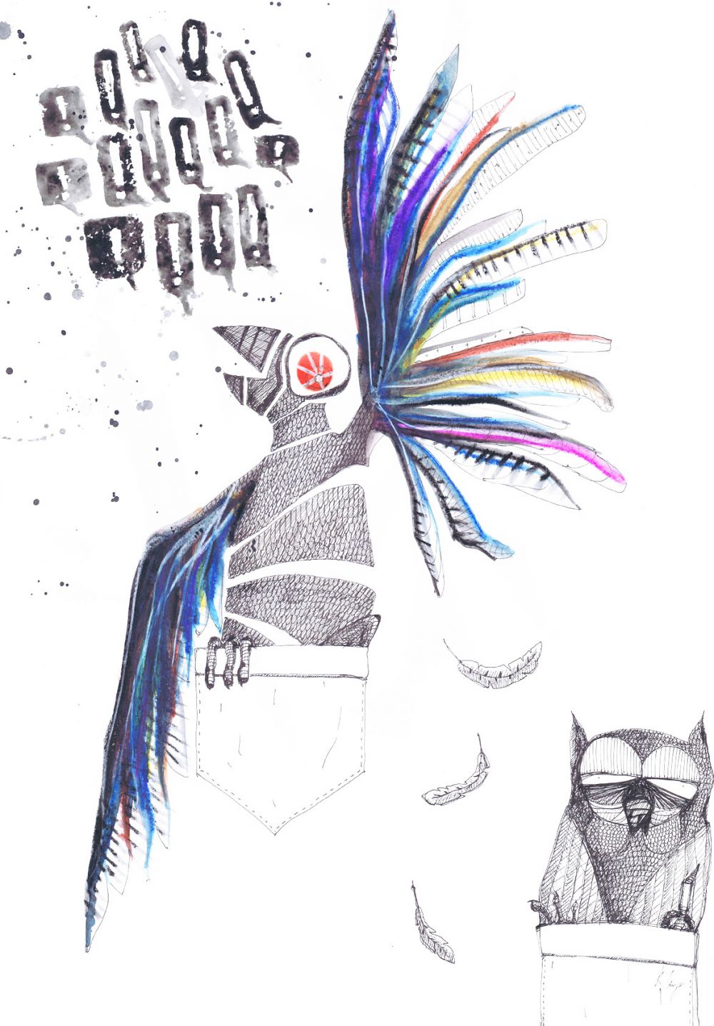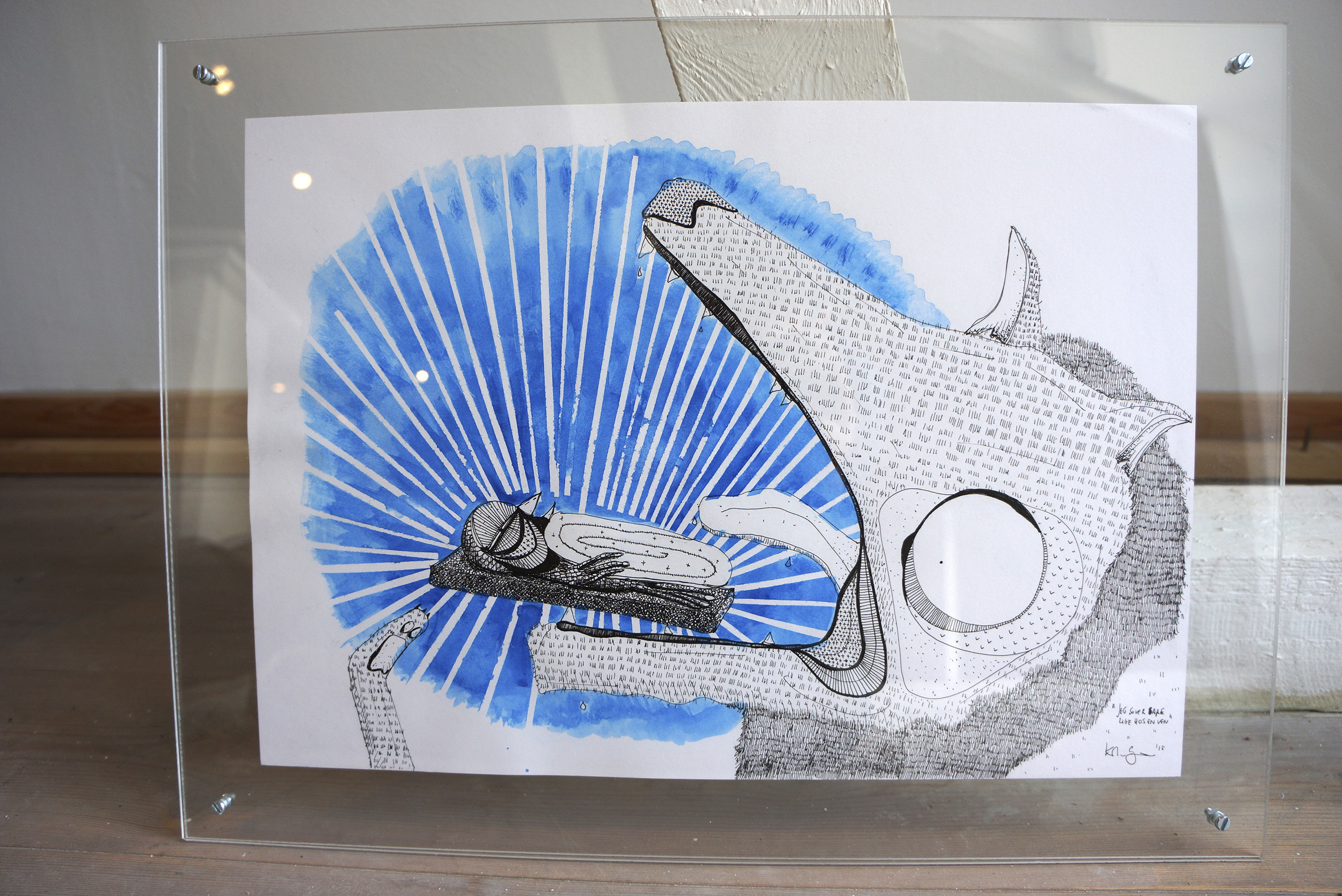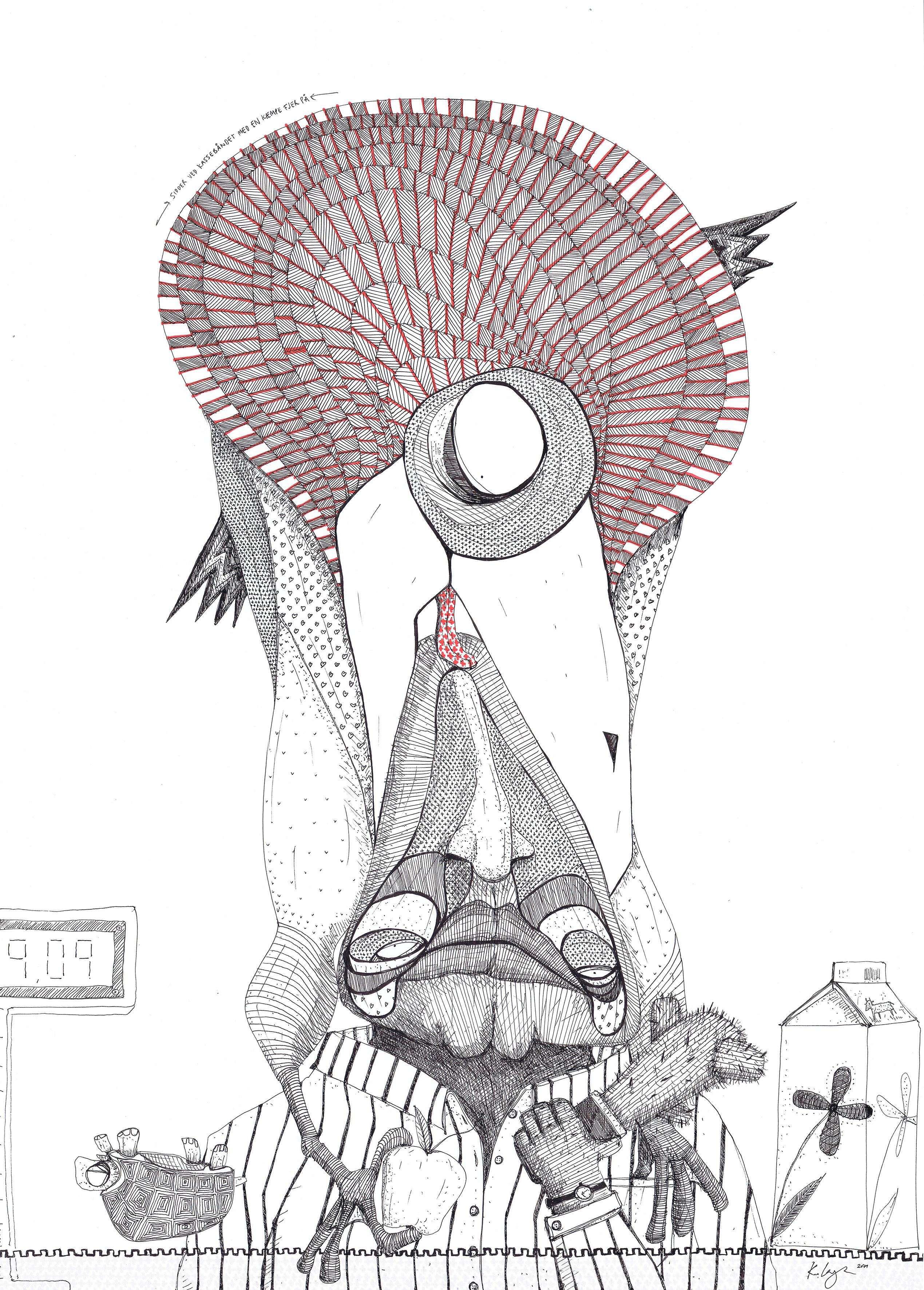 Sidder ved kassebåndet med en kæmpe fjer på (64 x 46 cm)